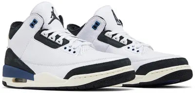 The A Ma Maniére x Air Jordan 3 Retro OG SP 'For The Love' features a white tumbled leather upper with soft grey suede overlays at the forefoot and heel. Molded eyelets and the Nike Air logo on the heel tab appear in a striking blue, adding a touch of contrast. This blue extends to the back portion of the foam midsole, which includes a visible Nike Air unit for cushioning. A grey rubber outsole rounds out the clean, premium design.