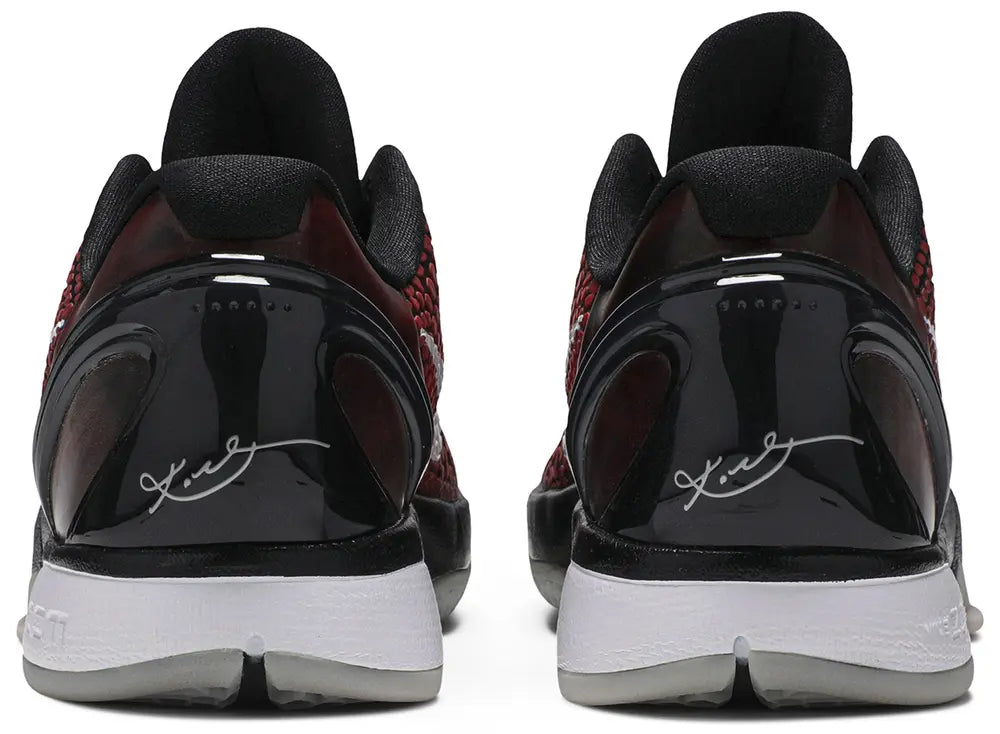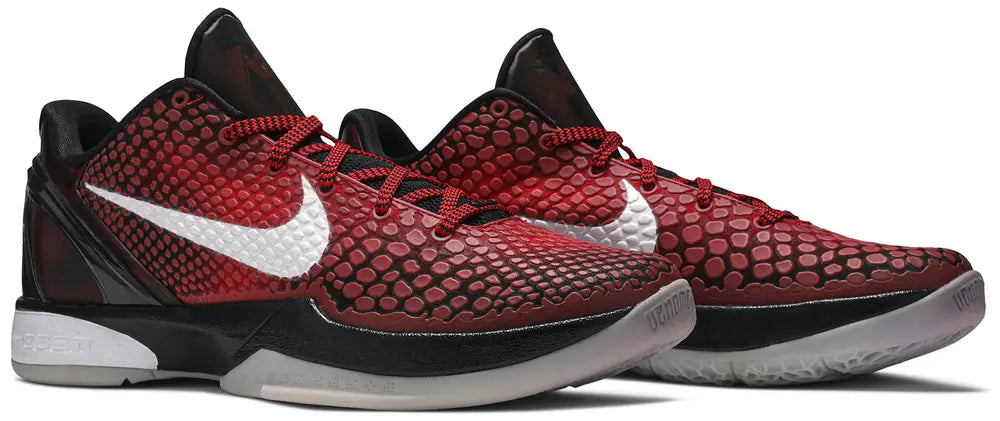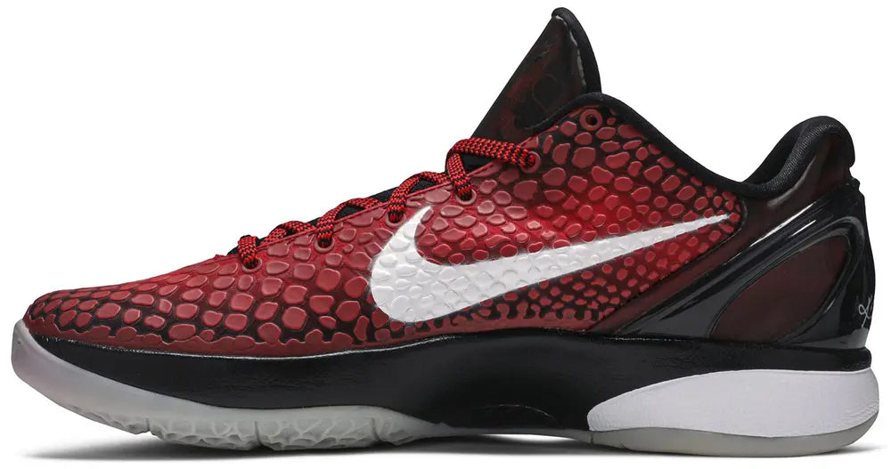 Reintroducing the colorway worn by Kobe Bryant during the 2011 NBA All-Star Game, the Nike Zoom Kobe 6 Protro “All-Star” (2021) features a red-to-black gradient micro-mesh upper with polyurethane scales, a full-length Cushlon midsole with a responsive Air Zoom Turbo unit in the forefoot, Kobe’s logo on the tongue, and his signature on the molded heel counter.